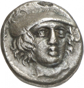 Vorderseite: Kopf des Hermes mit Kappe (petasos) von vorn, leicht nach r. gewendet.