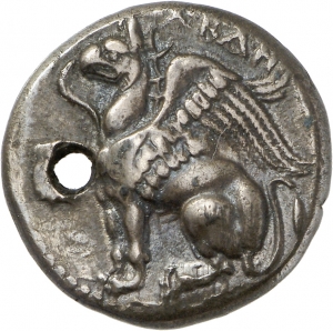Rückseite auf 9 Uhr gelocht. - Die Auswertung der Hortfunde durch Chryssanthaki-Nagle (2007) bestätigte die von May (1966) aufgestellte Abfolge der abderitischen Münzen, erbrachte aber eine Neudatierung der Serie, die nach Chryssanthaki-Nagle zwanzig Jahre später als von May angenommen beginnt. Prägungen des Beamten Philas werden ins Jahr 362 v. Chr. verlegt. Uneinigkeit besteht hinsichtlich des von Abdera angewendeten Münzfußes, während May vermutete, Abdera nutze das äginetische Gewichtssystem und gebe Statere zu 12,60-12,40 g aus, schlägt Chryssanthaki-Nagle einen lokalen Standard und die Bezeichnung Tetradrachmen vor.