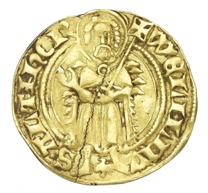 Unicum. Schrötlingsriss. - Die Münze ist eine Nachahmung der rheinischen Goldgulden, wobei die Rs. die Goldgulden Erzbischof Konrads II. von Mainz (1390-1396) mit dem Mainzer Rad als Mittelwappen imitiert. Die Rs.-Aufschrift dürfte als MONETA NO VERDIS zu lesen und VERDIS auf die Münzstätte Weert zu beziehen sein. Mit dem auf der Vs. genannten Wilhelm kann nur der 1415 bei Azincourt gefallene Wilhelm VII. als Herr von Altena und Hoorn gemeint sein. 1450 wurde die Herrschaft Hoorne (Horn) zur Reichsgrafschaft erhoben.