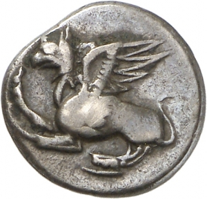Obverse: Greif hockt mit geöffneten Flügeln nach l. Die Vorderläufe sind erhoben.