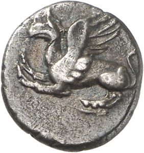 Obverse: Greif hockt mit geöffneten Flügeln nach l. Die Vorderläufe sind erhoben.