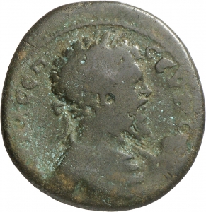 Rückseite: HΓ KAIKI ΛAP-ΓOV OVΛΠI ΠAV//TAΛIAC. Asklepios steht in der Vorderansicht und blickt nach l. In seiner gesenkten r. Hand hält er den Schlangenstab, über den l. in die Hüfte gestützten Arm fällt sein Mantelsaum.