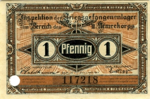 Vorderseite: Inspektion der Kriegsgefangenenlager im Bereich des III. Armeekorps 1 Pfennig 1 DER INSPEKTEUR DER ADJUTANT BERLIN DEN 1. OKT. 1917 Zahlungsmittel für KriegsgefangeneScheine mit ganz oder teilweise fehlender Nummer können nicht eingelöst werden. Zierrahmen und Zieruntergrund. Wertangabe, Ausgeber. Als Umschrift zwölfmal 'IGEFDREI'. Links unten Lochentwertung.