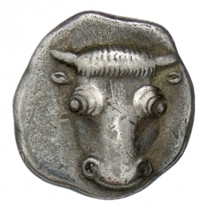 Rückseite: Φ-[Ο-Κ]-I. Kopf der Artemis nach l. in einem Quadratum incusum.