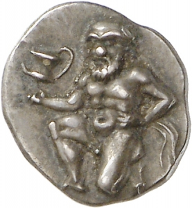 Vorderseite: Bärtiger Satyr mit Tierohren und Pferdeschweif kniet nach l. Kopf und Oberkörper sind fast in die Frontale gedreht. In der ausgestreckten r. Hand hält er ein Gefäß (kantharos), die l. Hand ist in die Seite gestemmt.
