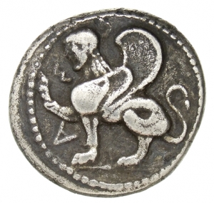 Vorderseite: Σ-Α. Sphinx nach l. hockend, die r. Vorderpfote ist erhoben.