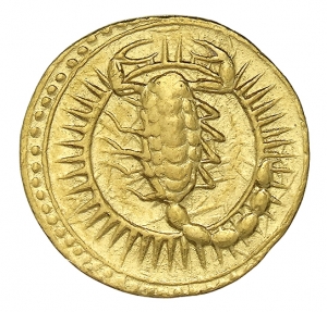 Vorderseite: Der Skorpion (Scorpio) als Zeichen des achten Monats des persischen Kalenders, Abaan. Im Hintergrund die Sonne.