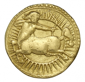 Vorderseite: Ein Kentaur als Bogenschütze (Sagittarius) nach links als Zeichen des neunten Monats des persischen Kalenders, Azar. Im Hintergrund die Sonne.
