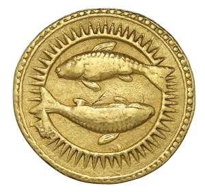 Obverse: Zwei Fische (Pisces) als Zeichen des zwöften Monats des persischen Kalenders, Isfandarmuz. Im Hintergrund die Sonne.