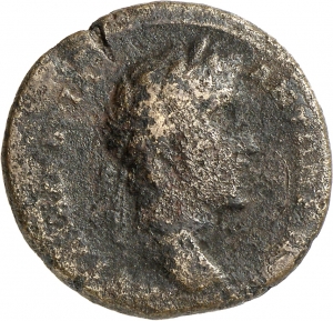 Vorderseite: [AV T] AI [Α]Δ[Ρ]ΙA - ΑΝΤΩΝΕ[Ι]ΝΟC. Kopf des Antoninus Pius mit Lorbeerkranz nach r.