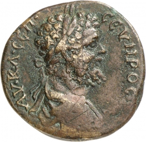 Vorderseite: ΑΥ Κ Λ CΕΠ - CΕΥHPOC. Drapierte Panzerbüste des Septimius Severus mit Lorbeerkranz in Rückenansicht nach r.