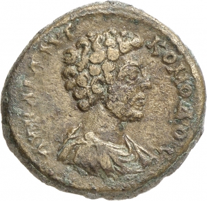 Rückseite: ΑΔΡΙΑΝ[Ο]-ΠΟΛEΙΤΩΝ. Dionysos steht mit Lorbeerkranz und verschränkten Beinen an eine Säule gestützt nach l. In seiner r. Hand hält er einen Thyrsosstab, der l. Arm ruht auf der Säule.