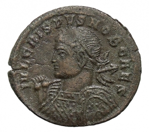 Vorderseite: IVL CRISPVS NOB CAES. Panzerbüste des Crispus mit Lorbeerkranz in der Brustansicht nach l. Die r. Hand hält einen geschulterten Speer, die verdeckte l. Hand einen Rundschild.