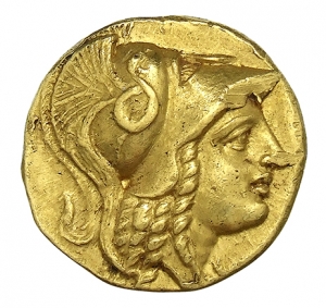 Vorderseite: Kopf der Athena mit korinthischem Helm nach r. Auf dem Helmkessel eine Schlange nach r.