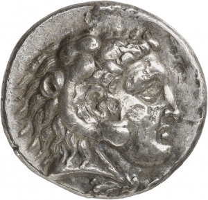 Rückseite: ΒΑΣΙΛΕΩΣ - AΛEΞANΔPOY. Zeus Aetophoros sitzt auf einem Thron nach l., in der l. Hand ein Zepter. Im l. F. fliegt Nike nach r., hält einen Kranz mit beiden Händen. Darunter ein Hermesstab (kerykeion) nach oben. Unter dem Thron ein Monogramm. Im Abschnitt Θ.