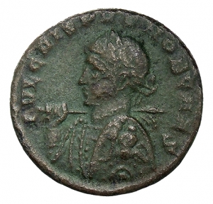 Obverse: IVL CRISPVS NOB CAES. Panzerbüste des Crispus mit Lorbeerkranz in der Brustansicht nach l. Die r. Hand hält einen geschulterten Speer, die verdeckte l. Hand einen Rundschild. Auf dem Schild eine figürliche Darstellung.