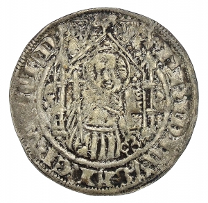Obverse: FRIDICVS AREPVS COLN [Fridericus Archiepiscopus Coloniensis]. Hüftbild des Heiligen Petrus mit Kreuzstab und Schlüssel in gotischem Gehäuse, oben zweimal das Wappen von Saarwerden.
