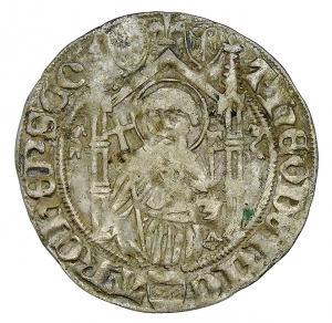 Obverse: THEODERIC - ARCHEPS CO [Theodericus Archiepiscopus Coloniensis]. Hüftbild des Heiligen Petrus mit Kreuzstab und Schlüssel in gotischem Gehäuse, unten das Moerser Wappen, oben zweimal das Wappen von Saarwerden.