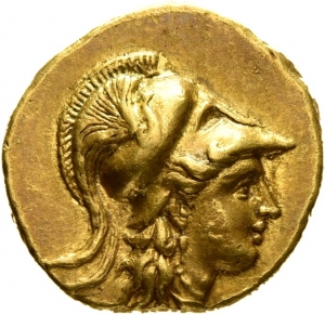 Vorderseite: Kopf der Athena mit korinthischem Helm nach r. Auf dem Helmkessel eine Schlange nach r.