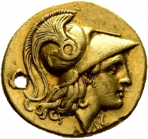 Vorderseite: Kopf der Athena mit korinthischem Helm nach r. Auf dem Helmkessel eine Schlange nach r.
