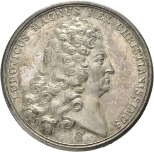 Vorderseite: LUDOVICUS MAGNUS REX CHRISTIANISSIMUS [Ludovicus Magnus Rex Christianissimus]. Kopf Ludwig XIV. nach rechts. Unten die Signatur TB als Monogramm.