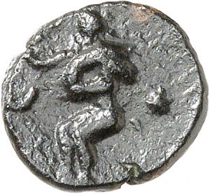 Rückseite: Eine weibliche Gottheit (Nike?) steht in Schrittstellung nach l. Sie hält in ihrer r. Hand einen Kranz über einen Kultstein (baitylos). Im l. F. ein Palmzweig.