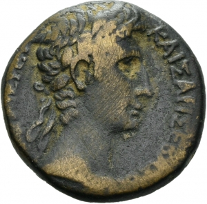 Vorderseite: ΚΑΙΣΑΡΙ ΣΕΒΑΣ[ΤΩ - ΑΡΧΙΕΡΕΙ]. Kopf des Augustus mit Lorbeerkranz nach r.