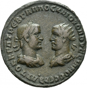 Vorderseite: AVTOK K ΓΑ ΤΡΕΒ ΓΑΛΛΟC ΚΑΙ ΟVΟΛΟVCCΙΑΝΟC CΕΒΒ [rundes E]. Drapierte Panzerbüste des Trebonianus Gallus mit Lorbeerkranz in der Brustansicht nach r., l., und gegenüber r. die drapierte Panzerbüste des Volusianus mit Strahlenkrone in der Rückenansicht nach l.