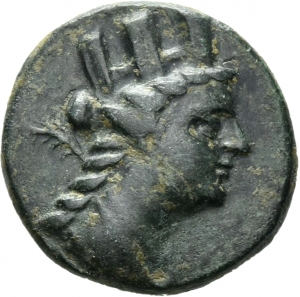 Vorderseite: Kopf der Tyche mit Mauerkrone nach r. Dahinter ein Palmzweig.