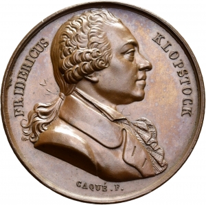 Vorderseite: FRIDERICUS - KLOPSTOCK. Brustbild des Friedrich Klopstock mit Perücke und im Jabothemd und mit breitkragigem Jackett nach rechts. Unten die Signatur CAQUÉ. F.