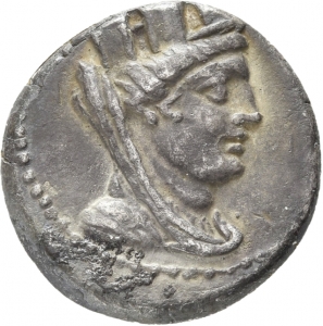 Obverse: Drapierte Büste der Tyche mit Mauerkrone und Schleier nach r.