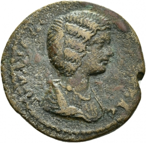 Vorderseite: IOVΛIA ΔO-[...] Π. Drapierte Büste der Iulia Domna in der Brustansicht nach r.