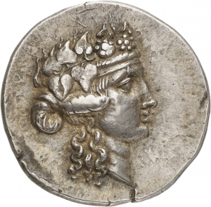 Vorderseite: Kopf des Dionysos mit Efeukranz mit Blüten nach r.