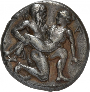 Vorderseite: A. Bärtiger Silen mit Glatze und erigiertem Glied im Knielaufschema nach r. In den Armen hält er eine Mänade mit hochgesteckten Haaren im langen Gewand (chiton). Sie streckt den r. Arm empor und senkt den l. Arm.
