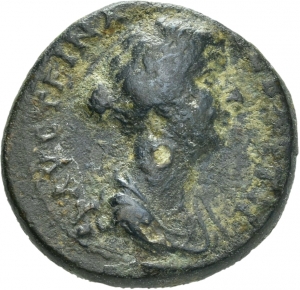 Vorderseite: ΦΑVСΤEΙΝΑ - [С]EΒΑСΤΗ. Drapierte Büste der Faustina minor in der Brustansicht nach r.