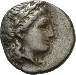 Vorderseite: Kopf des Apollon mit Lorbeerkranz nach r.