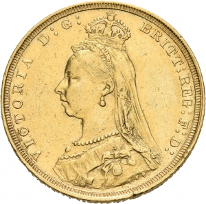 Reverse: Der Heilige Georg, den Drachen niederreitend. Im Abschnitt 1890. Rechts daneben die Initialen B. P. (Benedetto Pistrucci). Auf der Abschnittsleiste das Münzstättenzeichen S für Sidney.
