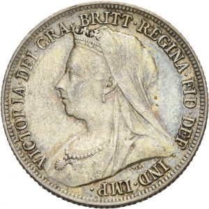 Rückseite: ONE SHILLING // 18-98. Ins Feld gestellte gekrönte Wappenschilder von England, Schottland und Irland, getrennt durch Rose, Distel und Kleeblatt. Darum die Kollane des Hosenbandordens.