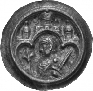 Vorderseite: Barhäuptiges Brustbild des Kuno von Minzenberg nach links mit geschultertem Schwert und Lilie (Minzenstengel?) in der Rechten unter mit Türmen geschmücktem Dreipass. Schriftlos.
