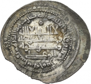 Vorderseite: Es gibt keinen Gott ausser Allāh / allein hat keinen Partner / Rukn ad-Daula / Abū ʿAlī / im Namen Allahs wurde dieser Dirhem geprägt in Fasā im Jahr fünf und fünfzig und dreihundert. Im Feld Glaubenssätze, Ehrenname und Kunya des Familienoberhaupts, innen umlaufend Prägeort und -jahr. Münzzeichen oben.