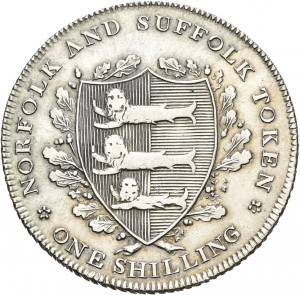 Vorderseite: NORFOLK AND SUFFOLK TOKEN - ONE SHILLING. Das Wappen von Yarmouth zwischen Eichenzweigen.