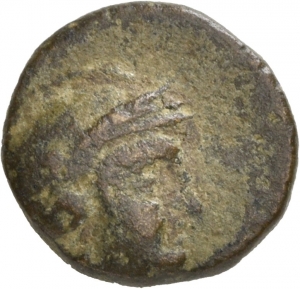 Obverse: Kopf der Athena mit attischem Helm, geschmückt mit Lorbeerkranz, nach r.