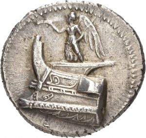 Vorderseite: Nike in eine Trompete (salpinx) blasend mit einer Schiffsstandarte (stylis) in der l. Hand steht auf einem Schiffsbug (prora) nach l.
