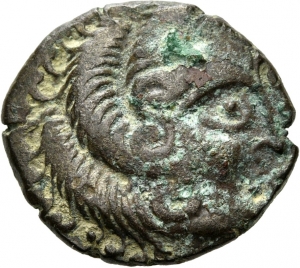 Vorderseite: Stilisierter, stark gelockter Kopf nach r. Die äußeren Locken S-förmig. Davor weitere Muster in Form von S-Voluten.