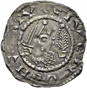 Rückseite: + HEIPONTI RVOVNVB. Kreuz, in den Winkeln von Perlkreis umgebene Kugeln.