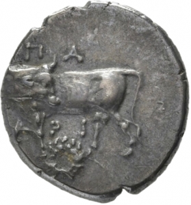 Obverse: Π-A/P-I. Ein Stier steht nach l. Der Kopf ist zurückgewandt. Darunter ein Kranz.