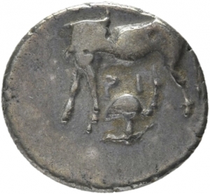 Vorderseite: [Π-A]/P-I. Ein Stier steht nach l. Der Kopf ist zurückgewandt. Darunter eine Sichel.