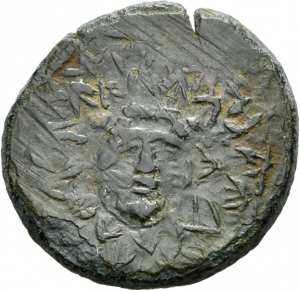 Vorderseite: Aegis mit Gorgoneion. Frontales Haupt der Medusa umgeben von konzentrischen Schuppen.