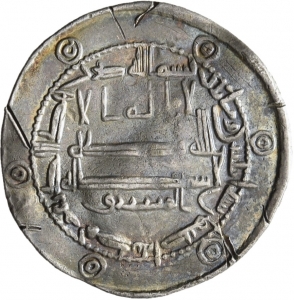 Vorderseite: Bi-smi llāh ḍuriba hāḏā d-dirham bi-madīnat Iṣbahān sanata iṯnatayn wa-miʾatayn -/ Lā ilāh illā / llāh waḥdahū / lā šarīk lahū / al-mašriq [Im Namen Gottes, dieser Dirham wurde geschlagen in Madīnat Iṣbahān im Jahr zwei und zweihundert Es gibt keinen Gott außer Gott Er ist allein er hat keinen Gefährten Der Osten]. Umlaufend Nennung von Nominal, Münzstätte und Prägejahr. Im Feld das Glaubensbekenntnis (Teil). Als Randzier sechs Kreise mit kleinem Kringel darin auf einfachem Perlkreis. Prägejahr 202 AH.