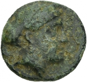 Obverse: Weiblicher Kopf (Aphrodite?) mit in einem Tuch (sakkos) hochgebundenen Haaren nach r.